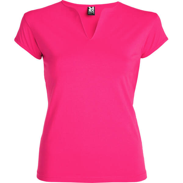 Getailleerd T-shirt met ronde kraag en V-opening, halve mouw, afgebiesd bij de schouder en zijnaden.