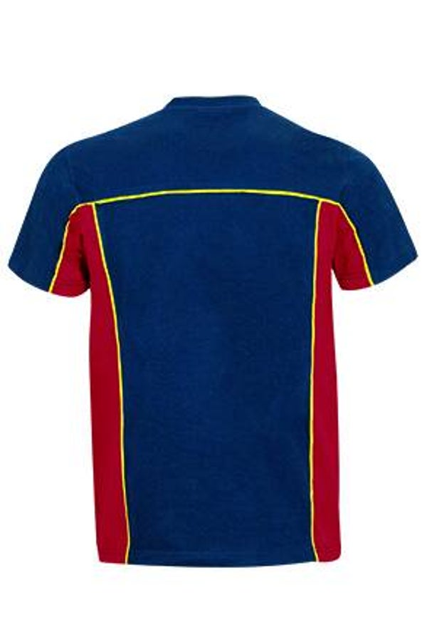 Marineblauwe basis met rode en gele strepen en biezen, met details van de Spaanse vlag op de voorkant.