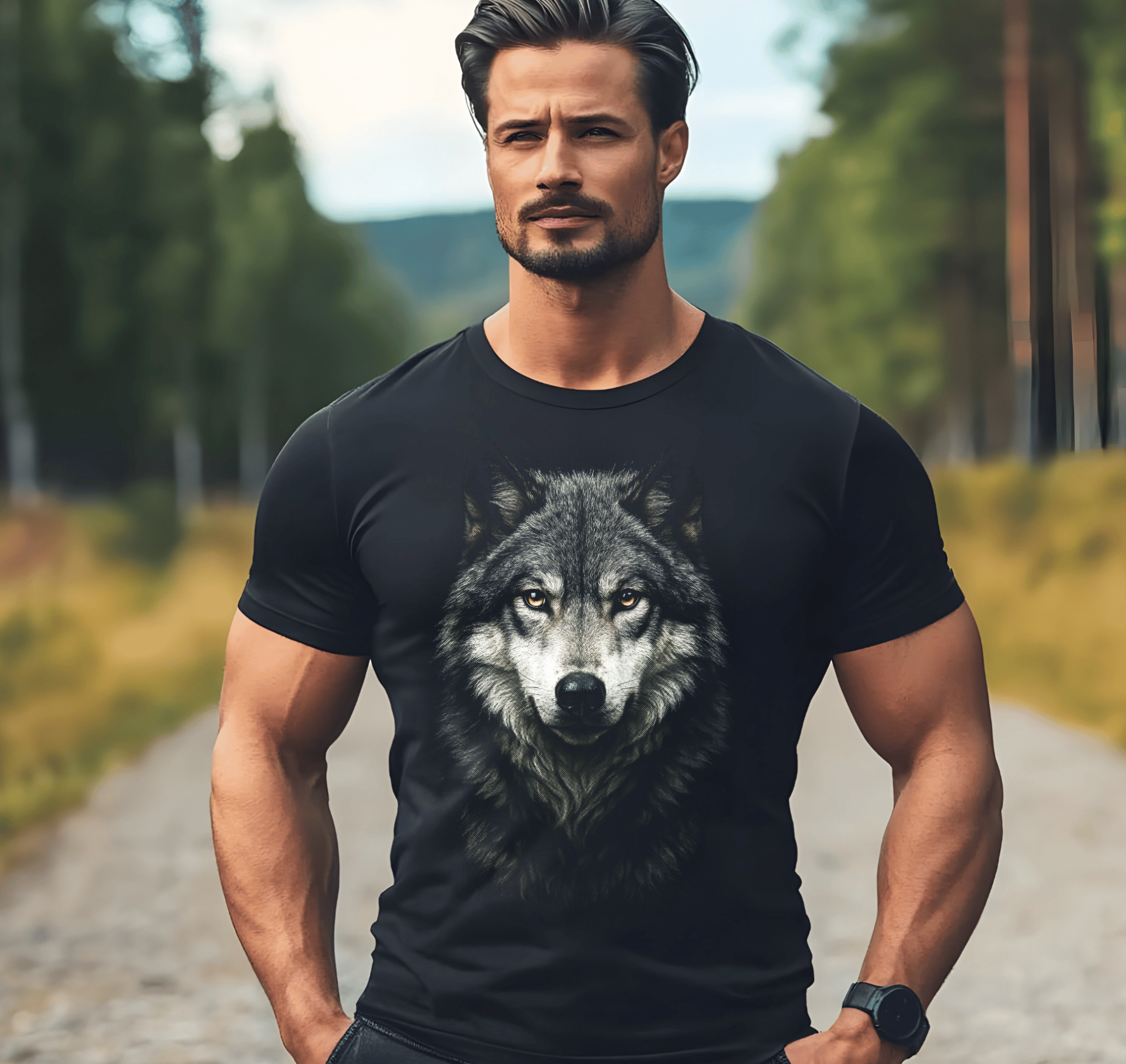 Zwarte T-shirt met halftone print bedrukking wolf.